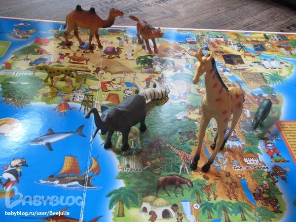 и вот теперь атлас у нас, Сын обалдел от того что бывают такие большие книги) и очень весело играть и ставить фигурки животных, узнавая кто где живет, ну а размер позволяет разместить фигурки разных размеров и в большом количестве)