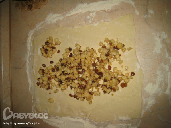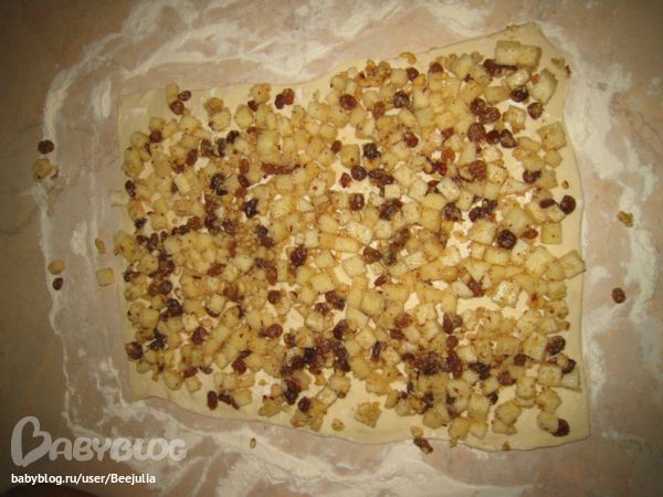 яблоки смешать с изюмом, орехами, корицой, ванильным сахаром (1 пакетик)