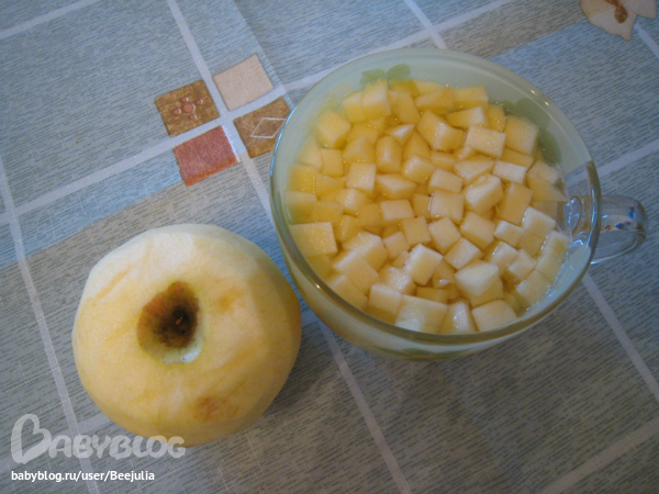 Яблоки (2шт) очистить от кожуры и нарезать кубиками, можно замочить их в воде или сбрызнуть лимонным соком, чтоб не потемнели