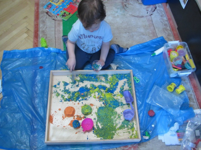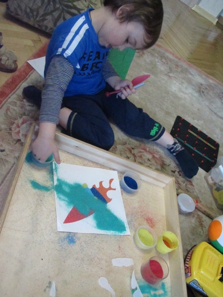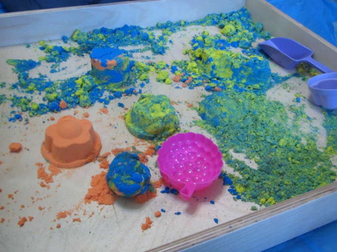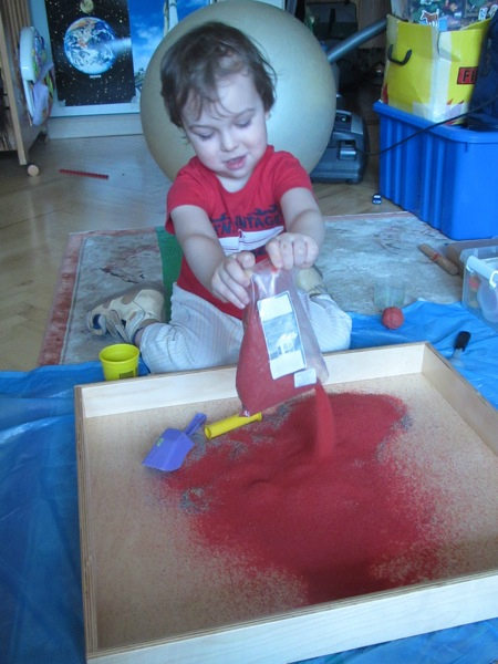 Играли с лунным песком, был у нас свой комплект, да еще и космической коробке был песочек лунный, так что получилось, что даже для нашей песочнице достаточно песка