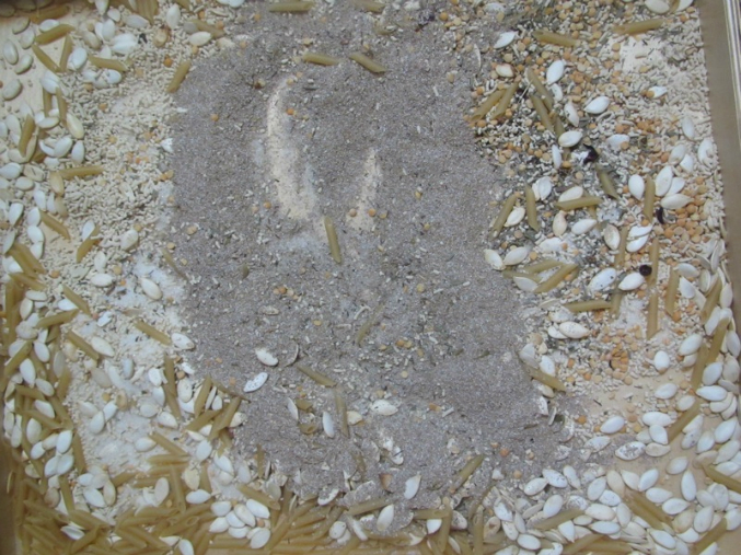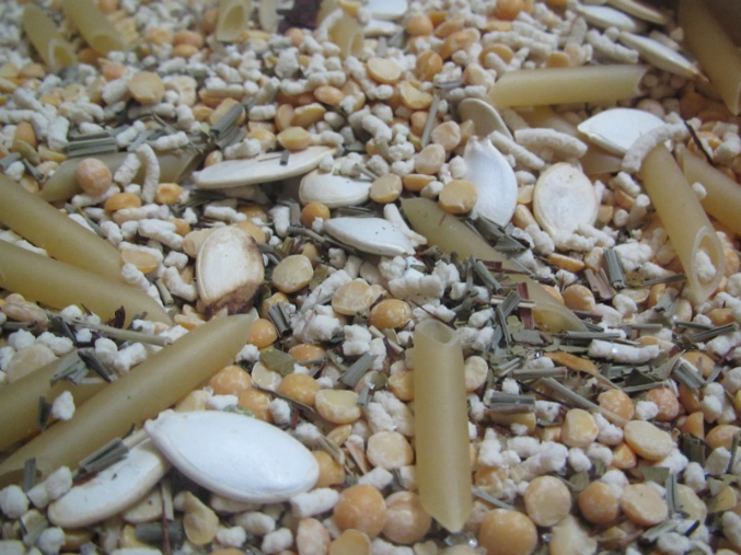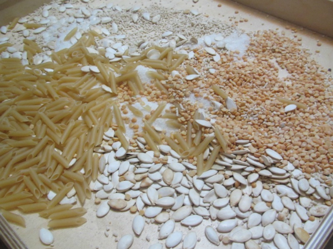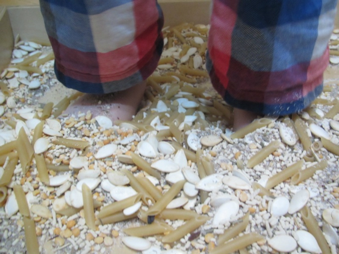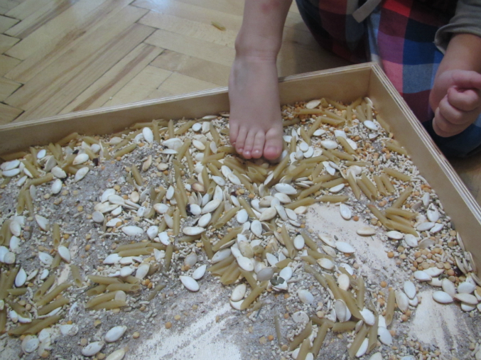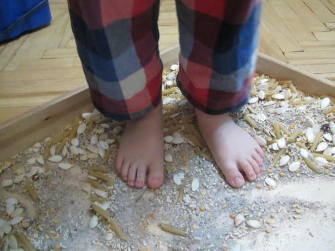 тыквенные семечки, макароны, отрубы, чай (заварка), горох. и еще у меня была упаковка детского чай с ромашкой, такой в гранулах. Кто-то подарил когда Степа родился, а мы такой пить не стали, уже больше трех лет лежал, ну я его тоже пустила в сенсорный ход)