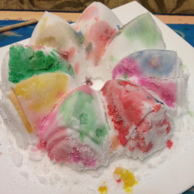 Соляной дворец. 3 стакана соли + 3 чайные ложки соли. Перемешать, чтобы вся соль оказалась намокшей. Выложить соль в формочку и забыть про нее на 24 часа. Вынуть скульптуру из формы и оставить еще на 12 часов. А потом отдать ребенку, выдав акварельные краски.