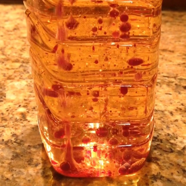 Наука ОПЫТным путемФорменные элементы крови.... Тьфу, Ну то есть детский эксперимент "вулкан в бутылке". Растительное масло, краситель пищевой и шипучка (аспирин) и красота в бутылке готова! Красителя берете побольше, а то какие-то у нас эритроциты маленькие получились