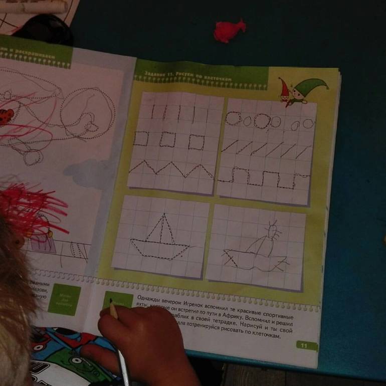 А в конце было задание нарисовать свой корабль. Вначале он начал рисовать по образцу и даже правильно повёл карандаш, а вот под конец решил сделать своё, красивее))) Это полицейский катер и мигалками и... фарами! ))