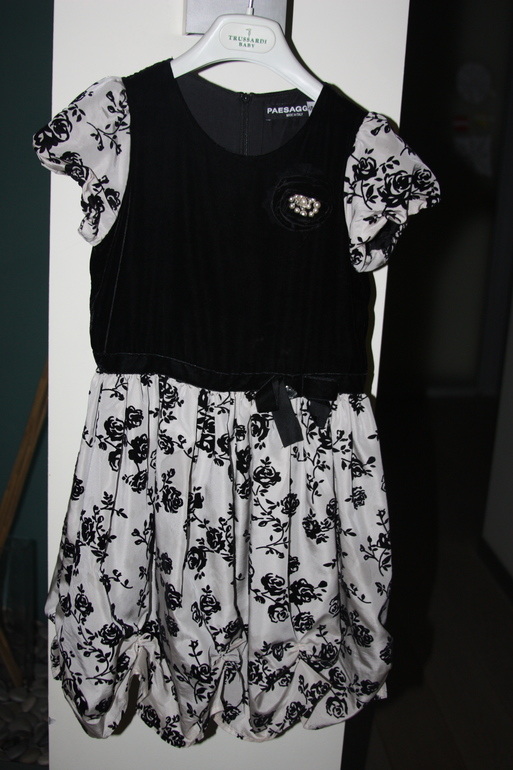 3.Очень красивое,из серии "дорого,но со вкусом" платье PAESAGGINO. 8 лет. Брошь отстегивается. Не смогла передать фактуру ткани с рисунком . Черный однотонный бархат,а цветной-на шелке бархатные цветы. 6 тыс