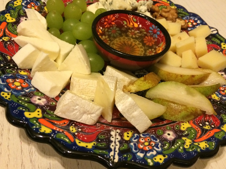 Она, конечно, составлена совсем не по правилам, но вкууусно! Моцарелла и пармезан наши, зеленая плесень из Аргентины, бри из Дании как бы, при этом на упаковке все на украинском, спасибо, братьям похоже))) орешки и фрукты "из леса вестимо", посередине самый вкусный мед на свете со своей пасеки, сибирская родня прислала.