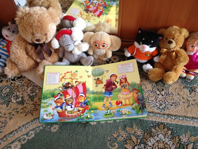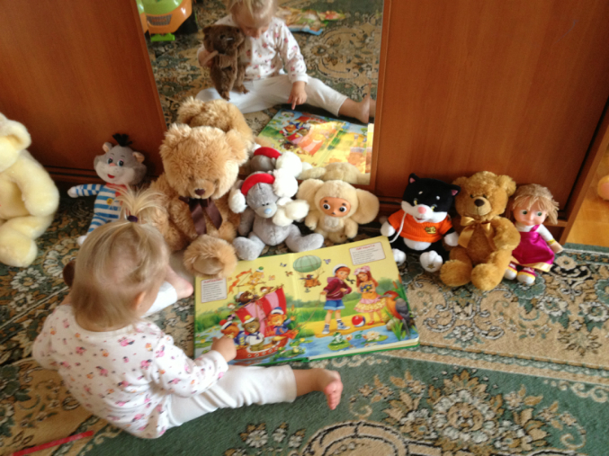 Усаживает все плюшевые игрушки в ряд, все, все, которые найдет, так что коробки с игрушками разбираются полностью! Приносит им книгу, очень долго, сначала сама им пытается, что-то объяснить, показать, прочитать, на своем языке, но мне кажется они ее понимают))))
