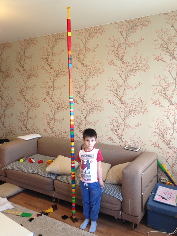 Она в таком виде простояла минуту-полторы) и ба-бах! Это был восторг))) я бы и успокоилась, построив с свой рост, но Саня нет, когда не смог достать ни со стула, ни с дивана, на помощь пришла я на стуле))