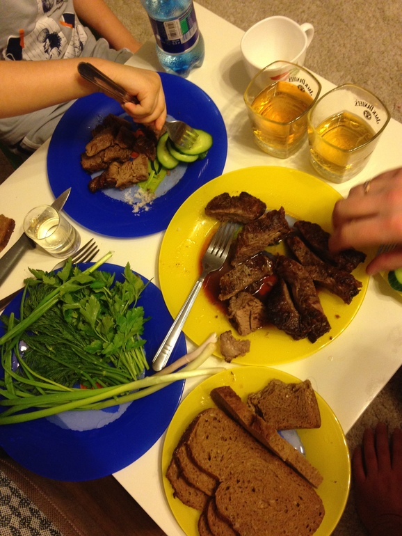 А потом дома... Мы зажарили в гриле мраморной говядинки, муж приготовил ростбиф и все это с зеленью, овощами да пивком уминали.