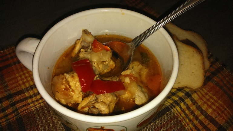 Курицу разделываем на кусочки как на шашлык и порциями обжариваем (не до готовности, а до румянца) на сковороде.На другой сковороде на сливочном масле томим до мягкости нарезанный полукольцами лук. Выкладываем курицу и лук в казан или большую сковороду. Также как лук доводим до мягкости кнупно нарезанный перец и перекладываем к мясу.Вливаем туда же банку томатов,солим и заливаем кипятком. Вода не должна покрывать мясо. Варим 20 минут,после чего добавляем измельченный чеснок, зелень и специи.Варим еще 5 минут.Перед подачей надо дать блюду настояться минут 15.Получается очень сытно и ароматно. Отличный вариант для пикника.
