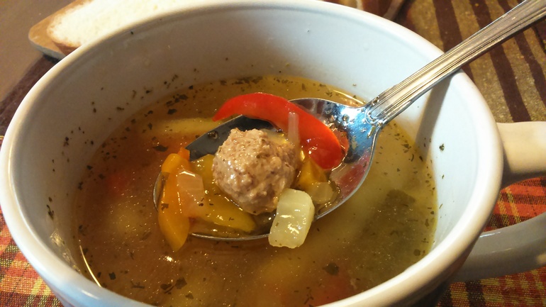 Формуем фрикадельки и отправляем их в кипяток. Картофель,морковь и перец нарезать брусочками, длиной с фасоль.Лук кубиком.Как всплывут фрикадельки, подождать еще 10 минут и отправить туда картофель. Потом заложить в кастрюлю спассерованные овощи. Соль, перец, любимые травки и суп готов!