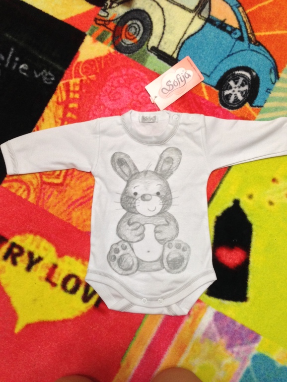 3.Комбинезоны флисовые, очень удобные. Мы их любили. С сердечками (цвет нежнее, чем на фото, больше к персиковому) 300 рублей, с зайчиком 200 рублей. Р-р 56 см. Мы надевали их в конверт.