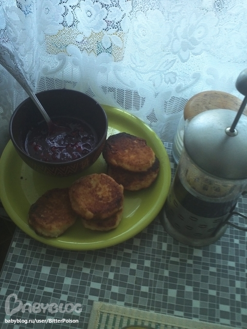 И у Андрея на десерт сырники с ягодным соусом и чаем.