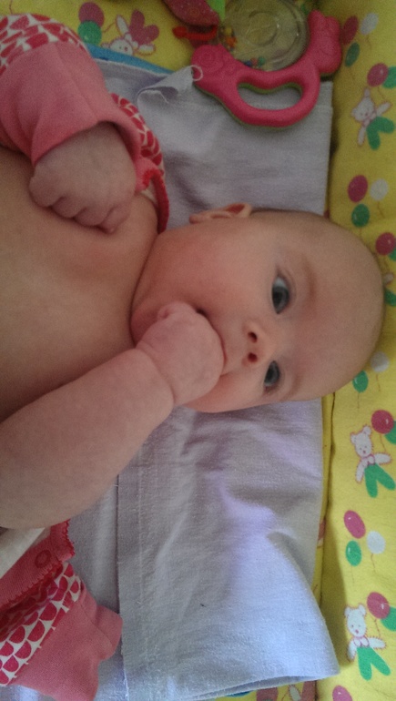 С утра улыбается и до самого вечера,плачет только когда спать хочет или кушать. Кулаки и слюни-это про нас,так же игрушки берет и мусолит. В коляске на улице спит по 2-3часа,дома ситуация хуже-по 30-60 минут раз 5-6 в день. Разговаривать безумно любит,гулит во всю,особенно с папой -нашли общий язык)))