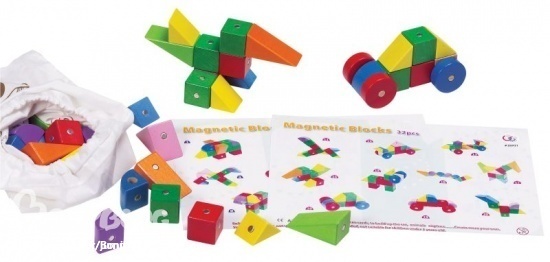 В комплекте: 28 магнитных деталей из дерева (геометрические фигуры, животные, человечки), карточки с примерами в натуральную величину фигурок, двусторонняя металлическая доска, которая удобно складывается чемоданчиком.