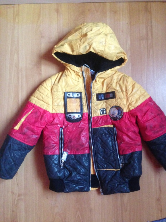 размер 116.Не промокает. Очень симпатичная(черные пятнышки точечками это сама модель куртки такая).Есть небольшие нюансы на бегунке сломан язычок. Не проблема дума поменять и немножко поцарапали.при носки не видно.регион почта.