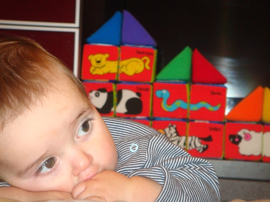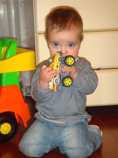 Обожает играть в мячик (кидает, катает, толкает), собирает пирамидку беспорядочно, естественно, возить и катать все, что движется и катается... Полюбил кубики, ура!!!