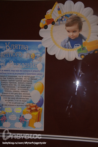 Растяжка, очень нежные ромашки с Ванькиными фотками. Клятва почетного гостя, в которой есть окошки для афтографов гостей...