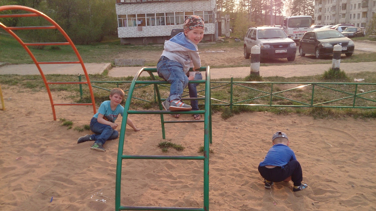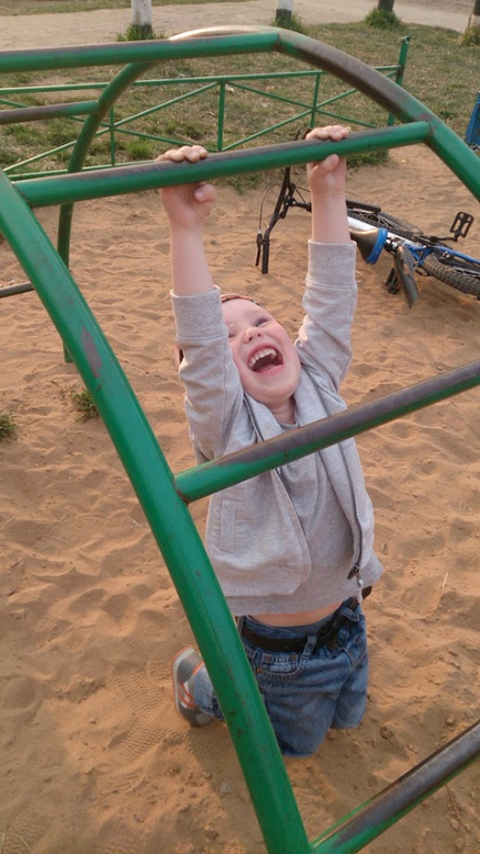 Потом залез на большую, чуть не свалился, папа вовремя его спас.