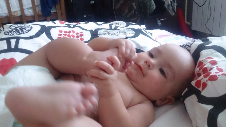 Васька умеет уже много чего. Активно крутится со спину на живот, обратно и вокруг своей оси. Неплохо перемещается по кровати и вперед и назад, так что теперь за ней глаз да глаз. Хватаем, все что есть в зоне доступа. Особенно любит всякие тряпочки. Все, что схватили, надо срочно-пресрочно съесть :) В наличии уже 2 зуба, а еще 4 на подходе.