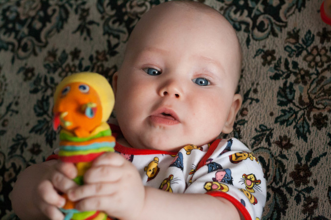 появилась буквально 5 минут назад))) Вить научился трясти погремушку, трясет ее пока еще неуклюже, но старательно и сам от этого хохочет)))