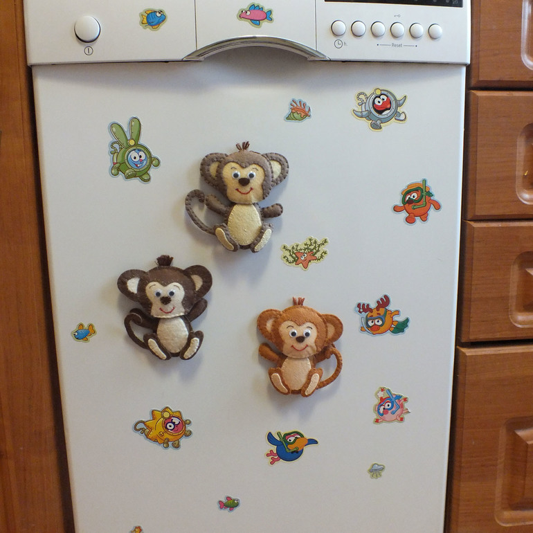 Выкройку делала по рисунку - на оригинальность идеи не претендую. У этих обезьянок вшиты неодимовые магниты, а ещё хвосты можно изгибать - внутри проволока.