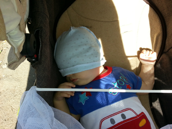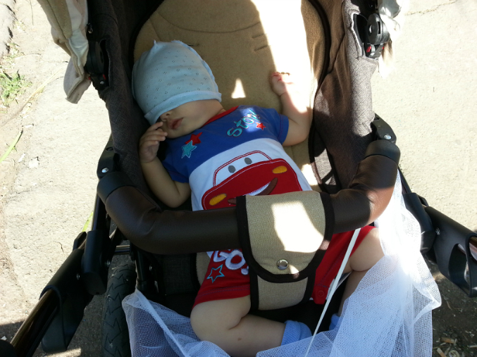 вы как большие уже в прогулке катаетесь?! клёвый пацанчик. а идея с шапкой меня не посещала.тож на зеньки от солнца попробую натянуть