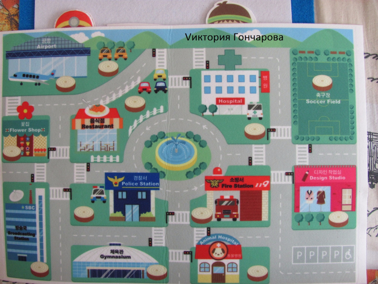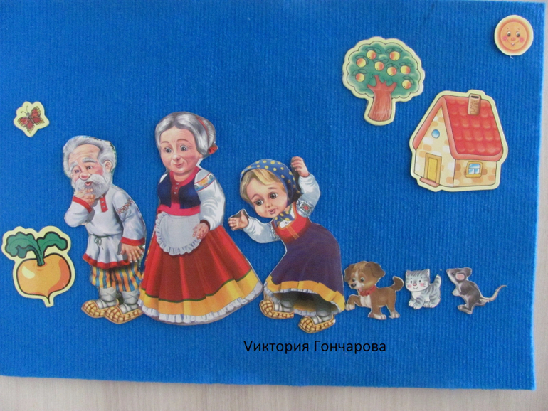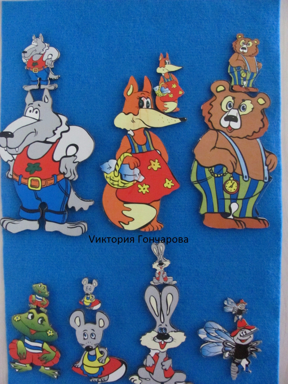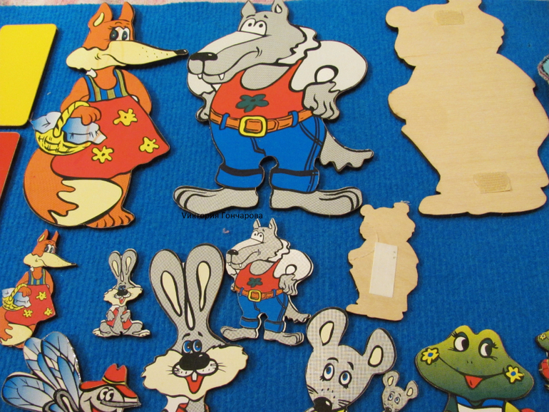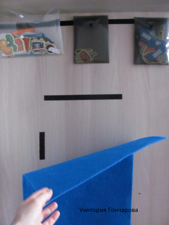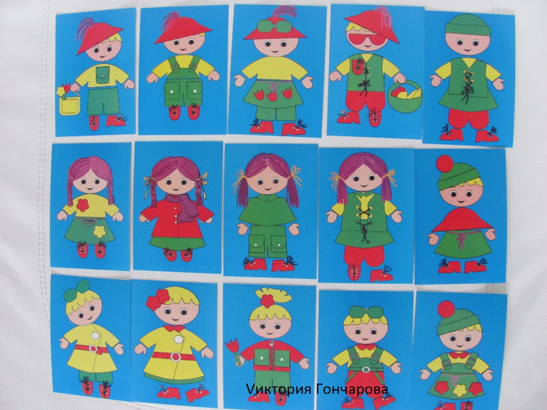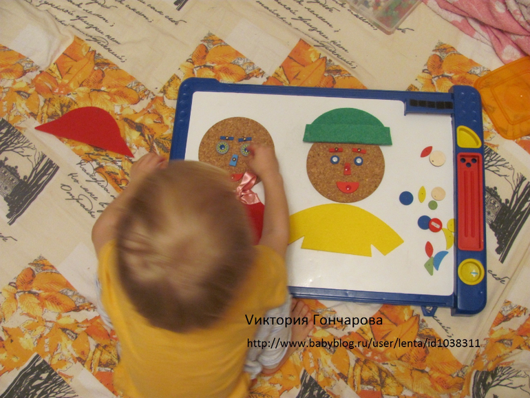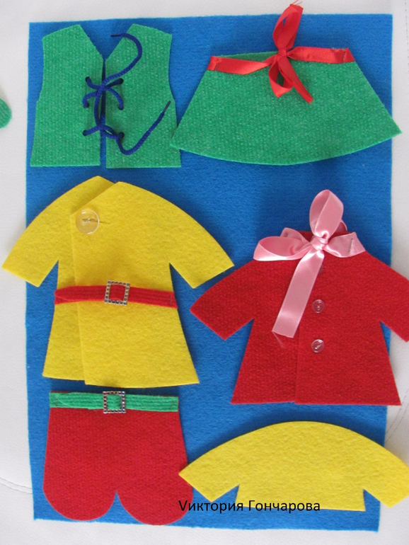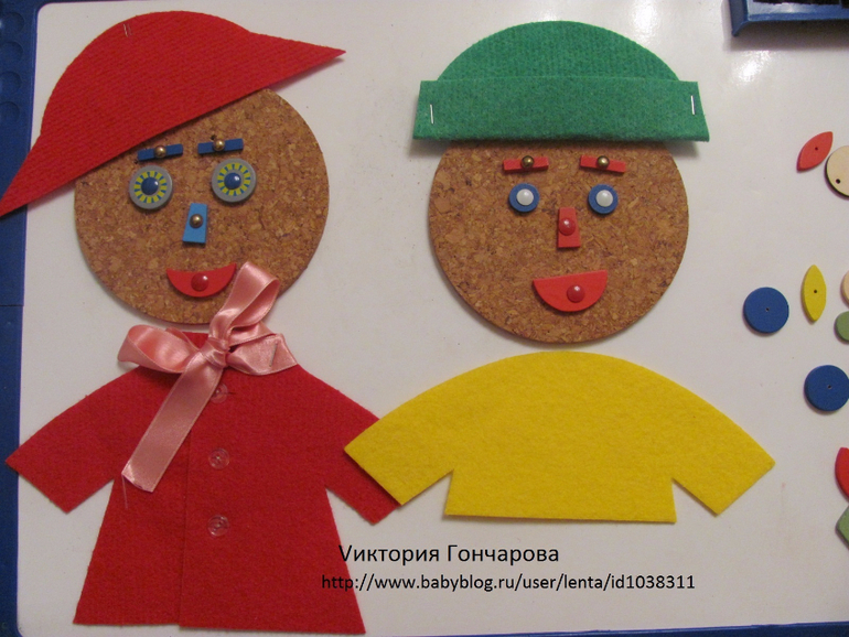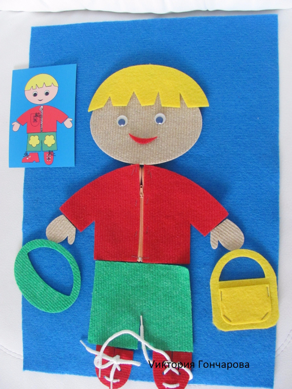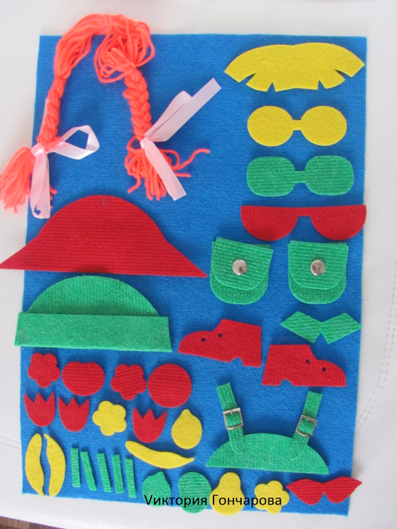 Появился у нас вместе с домиком-теремком. В набор входит ковролиновое поле размером 35*50, детали одежды из ковролина на липучках, карточки для составления образов.