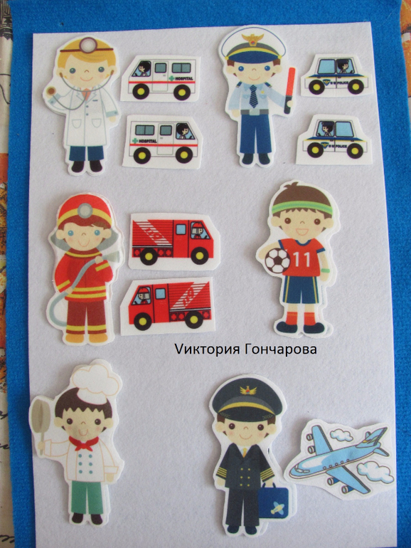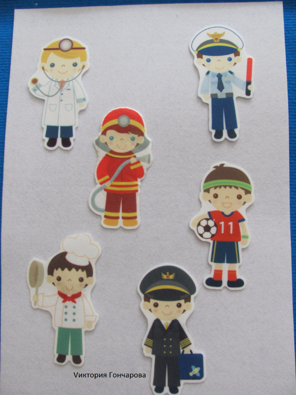 Но приклеила с обоих сторон клейкую ленту-липучку, и вот вам задание "Найти и собрать фигурки" - чем мы и занимались, а заодно и знакомились с профессиями.