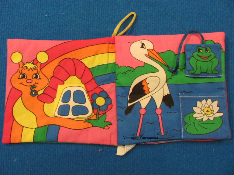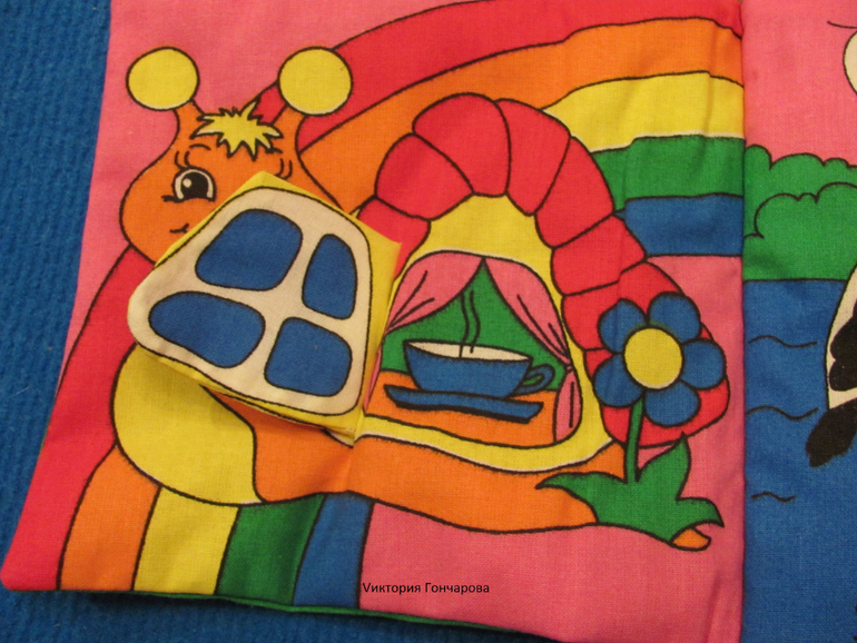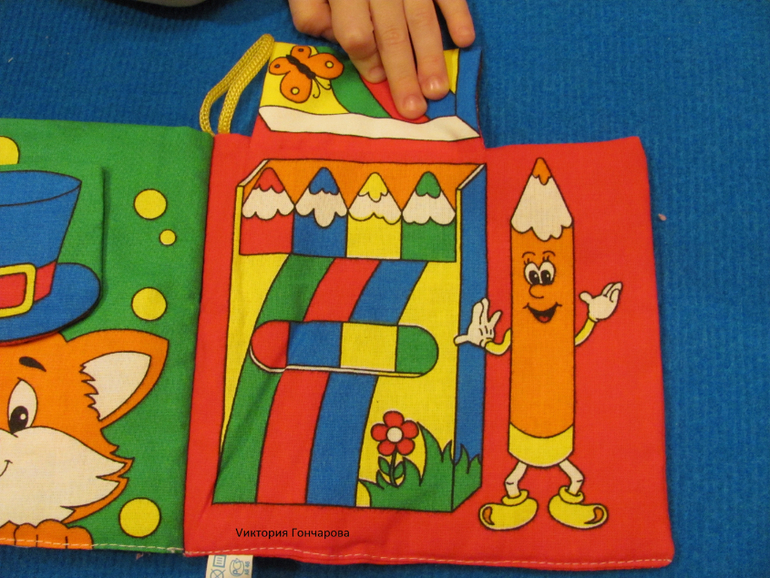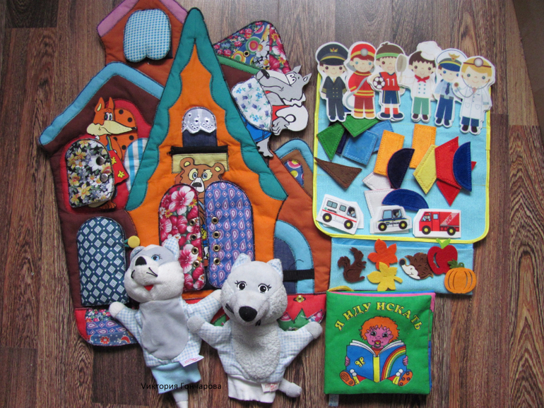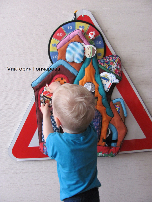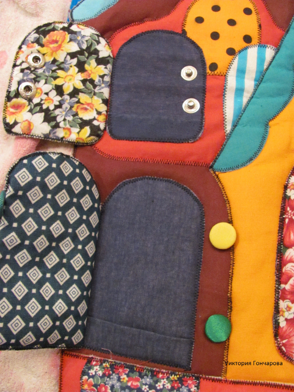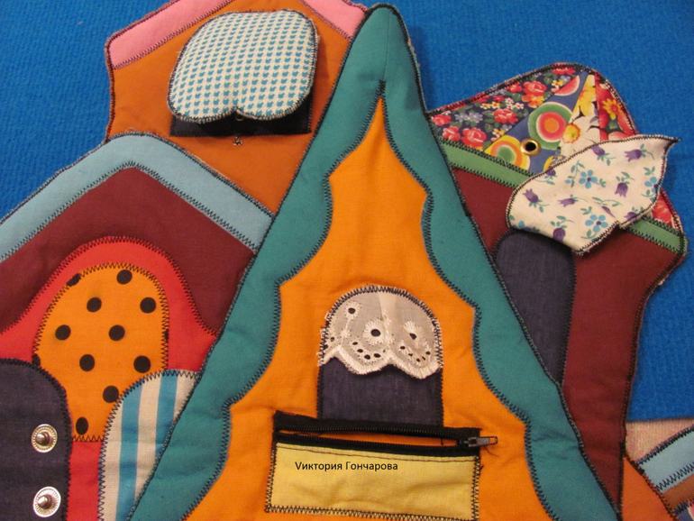 Сшит теремок из ткани (размеры 60х36 см), содержит двери с разными застежками - липучка, шнуровка, пуговки, кнопочки, молния, крючочки. Сшито все очень качественно. Мы крепили теремок на ковролинограф.