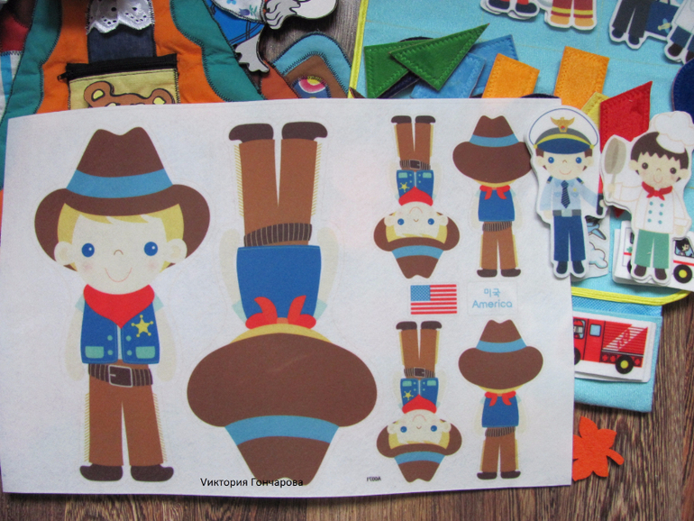 Фетровый лист с изображением основных профессий. Примечательно - вид спереди и сзади. Когда покупала обдумывала сшить две половинки, сделать мягкие куклы.