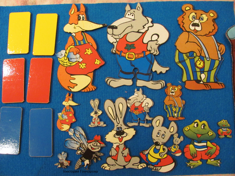 Как и полагается в теремке живут мышка, лягушка, зайка, лиса, волк, медведь и комарик. Это деревянные плоские фигуры (картинка наклеена) двух размеров. Также в состав игры входят парные таблички с основными цветами, с которых следует начинать изучение цветов, и методичка для работы, включает сказку "Теремок" на русском (в обработке М.Булатова и Е.Чарушина) и английском языках. Методичку можно скачать и полистать здесь.