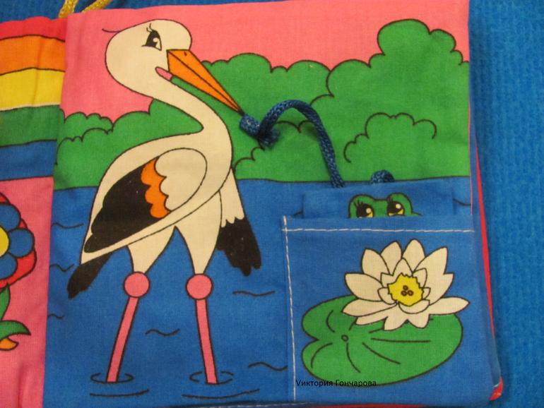 Из недостатков - детали скреплены степлером, от этого некоторые детали, например на молнии, неудобно застегивать/расстегивать. Но можно все пришить вручную, т.е немного доработать. И еще т.к все на липучках, поэтому все слипается друг с другом, волосы так вообще мы убирали в пакетик, чтоб не распушился). Играли не так часто, но играли. Больше у нас использовалось само поле. К нему прилипила липучку и повесила на видное место. Сверху, если заметили, кармашки с разными картинками.