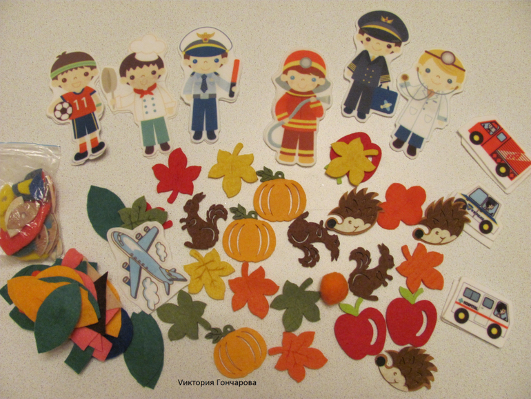 Думаю про часть фигурок - ежики, белки,листья, яблоки, все знают - фикспрайс. Вторая часть - вырезанная из обычного фетра - листья, использовали в играх с мозаикой.