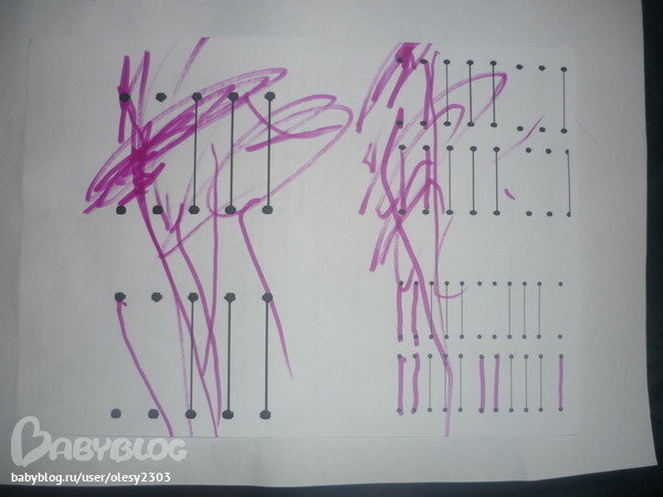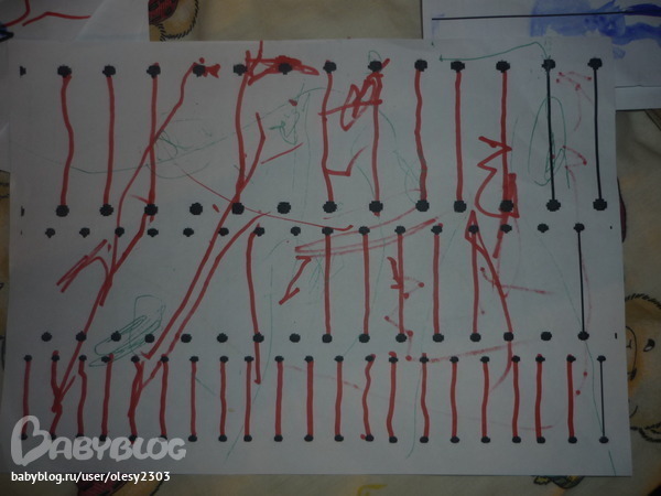 - Теперь предложите малышу самому попробовать нарисовать ниточки. И не забудьте похвалить ребёнка за старание и усидчивость.