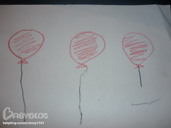 - Предложите малышу дорисовать ниточки к шарикам. Но сначала покажите, как это делать. Карандаш приставить к «хвостику» шарика и вести вниз. Затем возьмите руку малыша и вместе с ним нарисуйте ещё одну ниточку к шарику.