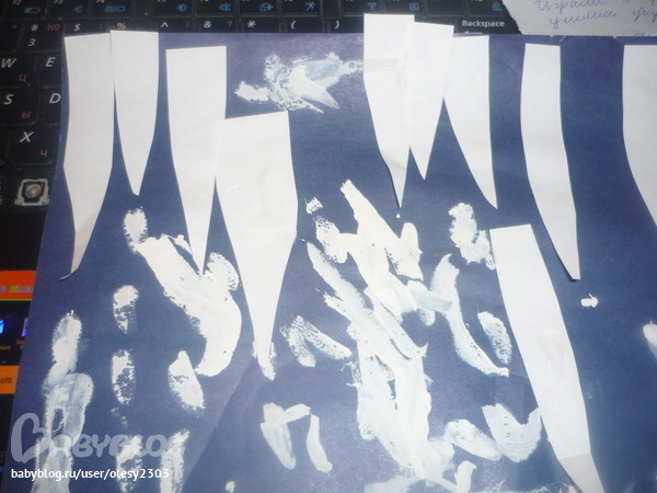 - Дайте ребёнку кисть (мягкую) и белую гуашь. Пусть нарисует капельки, которые стекают с сосулек.