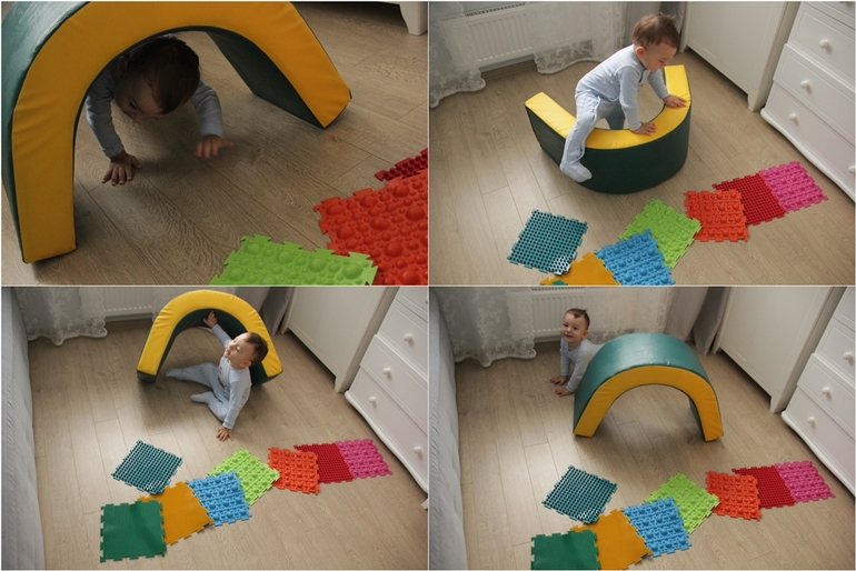 В конце немного физической активности. Прыгаем как зайчики, топаем как мишки, приседаем, руки поднимаем, летаем бабочкой, птичкой, пролезаем под препятствием, переступаем, бегаем по ортопедическому коврику. Хочу купить еще ранний старт, правда квартира 36 кв.м., думаю о складном варианте.