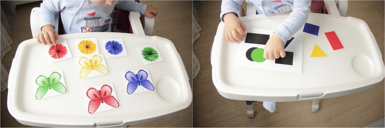 Делаем разные упражнения: сортируем, играем в лото, теневое лото, просто называем цвета предметов, ищем разные формы на картинках. Сортирует хорошо, подбирает по цветам и формам. Логика работает. Названия форм и цветов не могу понять знает или нет, так что пока я не засчитываю.