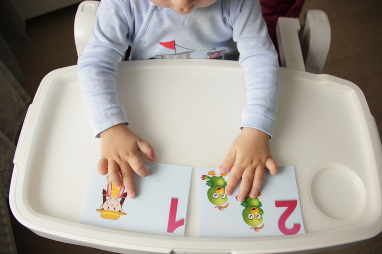 Очень любит считать, так что считаем все подряд: карточки, предметы, части тела.