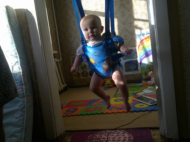 Немного пройдусь по пунктам плана. Из первого новшества у меня появились летунки. Это всего лишь обычные прыгунки, повешенные повыше. Прыгать как положено Алиса пока отказывается, а так я ее прыжиню вверх-вниз, раскачиваю как на качелях и закручиваю в одну сторону и отпускаю раскручиваться. Замечательно развивает вестибулярный аппарат (подсмотрено у Даниловой).