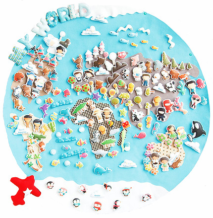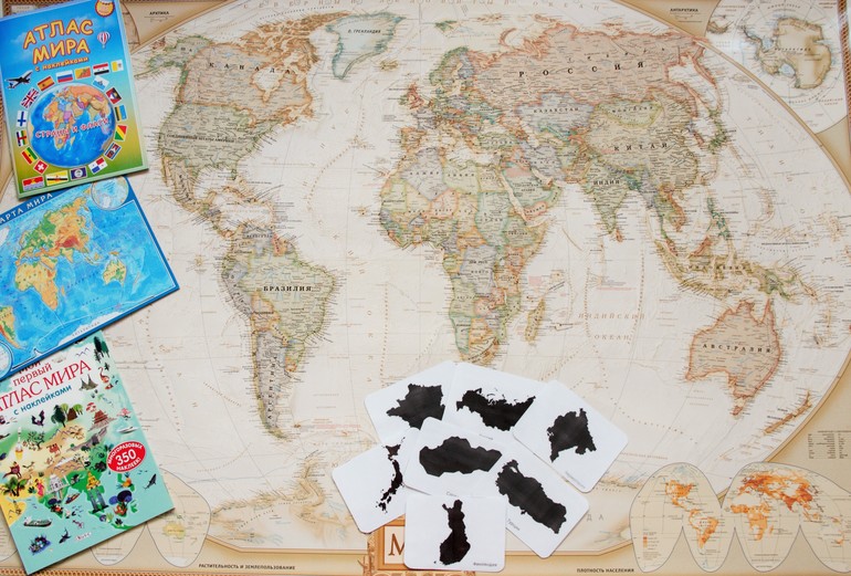 На самом деле, материалов у нас пока не очень много, но все они по делу. Самое первое - это карта мира. Без нее же нельзя обойтись. У нас самая обычная. Мне она нравится, она неяркая, но достаточно четкая и подробная. Обычно она висит на стене, но для занятий (или просто по просьбе Даши) мы ее достаем и кладем на пол. Что можно делать, я думаю, рассказывать уже нет смысла: все давно знают. Во-первых, проговаривать материки и океаны, обсуждать, что океан больше, а море меньше, рассказать малышу, что есть озера и пруды, есть реки. Рассказать про материки, можно даже попрыгать на них, моментально перемещаясь между странами одним прыжком, а можно взять самолетик и летать. При этом рассказать, что на самолете летать можно как угодно, потом взять пароходик и плавать по морям, рекам, океанам. И здесь обратить внимание, что пароход плавает только по воде, поэтому путь из точки А в точку В может быть длиннее, чем на самолете. А можно придумать даже квест: поселить одну игрушку, скажем, в Америке, а другую, в Антарктиде, дать малышу самолет, машинку и пароход и предложить ему самому проложить путь. В общем идей миллион и маленькая тележка. Главное проявить фантазию)