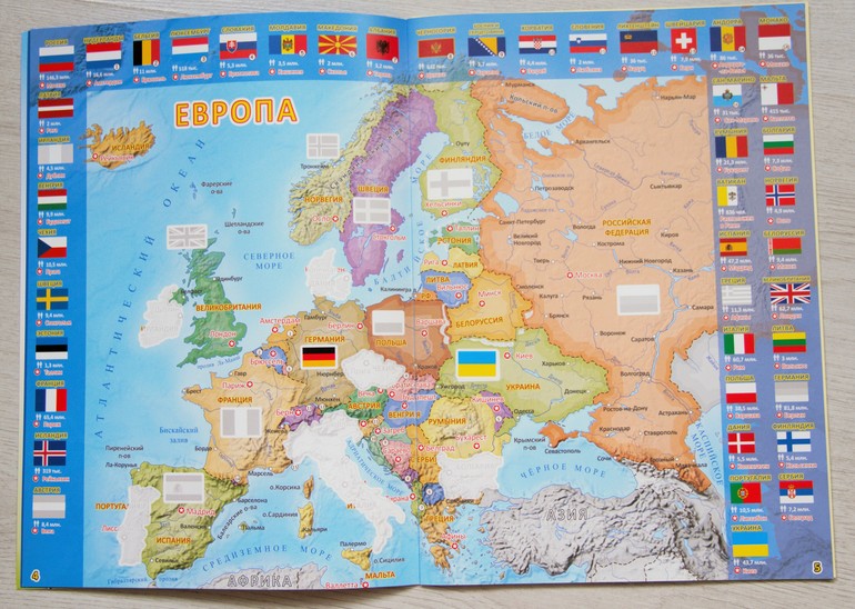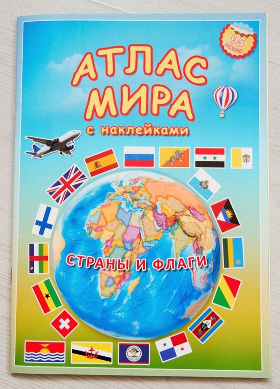 Раз уж мы заговорили про Геодом, то покажу еще и Атлас стран мира с флагами. Это альбом с наклейками, который знакомит малышей со странами и их флагами. Каждая страничка посвящена отдельному континенту , его странам и их флагам плюс отдельный разворот для России. Соответственно ребенку предлагается вклеить либо страну, либо ее флаг. Качество исполнения отличное. Но я бы не назвала это must have. Если вам попадется по адекватной цене (я покупала за 120 рублей), то смело берите, брать на Лабиринте за 260 руб. я бы не стала, это цена явно завышена.