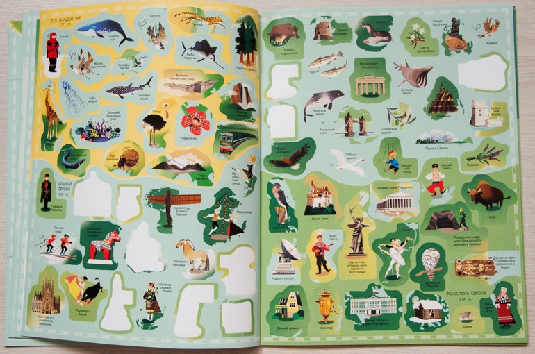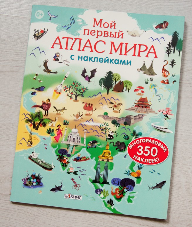 Продолжим с наклейками. Есть у нас еще один атлас мира с наклейками от издательства Робинс. Он так же разбит по материкам, но в качестве наклеек предлагаются животные, достопримечательности, аборигены и национальная одежда. Наклейки яркие, качество отличное. В целом хорошее пособие для того, чтобы наглядно показать малышу, кто где живет и чем материки отличаются друг от друга. Цена на этот атлас не маленькая, я бы советовала ждать хороших скидок.