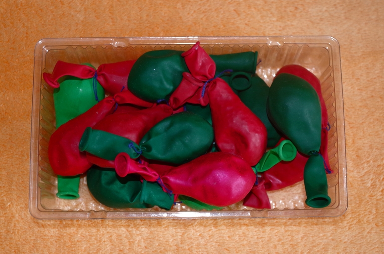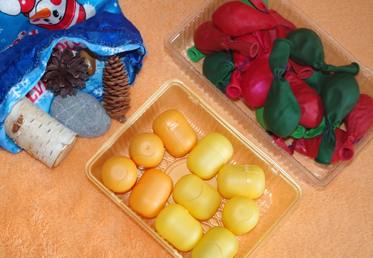 У меня 20 шариков, т.е. 10 пар шариков. В одной паре одинаковое содержимое. У меня это: мука, соль, рожки, фасоль красная мелкая, фасоль белая крупная (лима), кедровые орешки, рис, горох, овсянка и гречка.