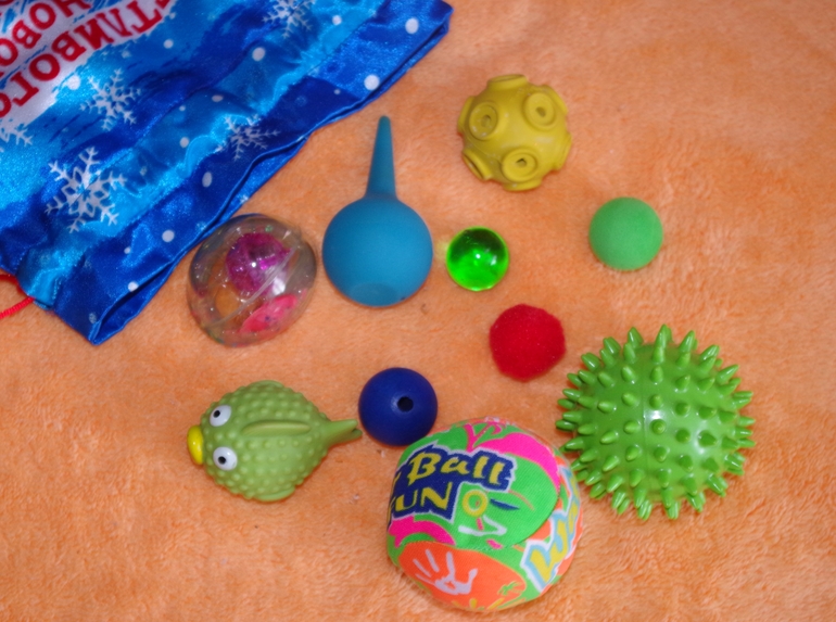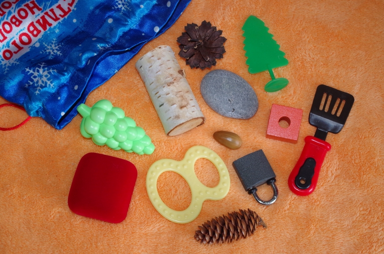 Для деток постарше можно усложнить задачу, положив в мешочек, например всё круглое, но разной фактуры (колючее, шершавое и т.д.) и состоящее из разных материалов (резина, дерево, стекло (безопасное), ткань и т.д.)