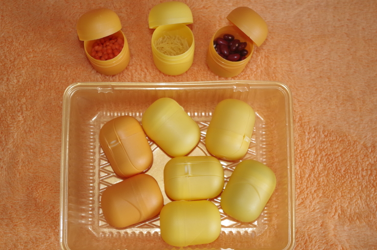 Комментарий Инны мне напомнил о том, что детки, действительно, могут открыть эти контейнеры. Поэтому, чтобы ребенок не открыл контейнеры, попробуйте поместить их в плёнку для пасхальных яиц и опустить в горячую воду, плёнка стянется и её очень трудно будет снять без помощи ножниц.