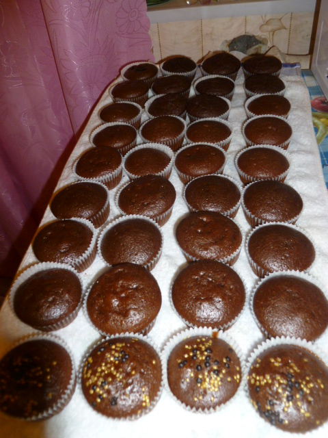 По рецептам Елены Чуркиной : 12 из них по рецепту ШОКОЛАДНЫЕ МАФФИНЫ, а остальные по рецепту ИДЕАЛЬНЫЙ ШОКОЛАДНЫЙ КЕКС. Делаются на раз-два, впрочем как и все ее остальные блюда.
