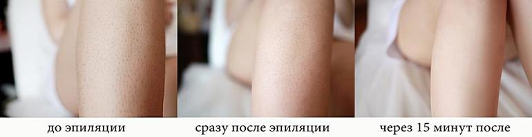 Нет отёков, покраснений в особо чувствительных зонах, как это часто бывает после депиляции воском. Уже через 20-30 минут кожа абсолютно спокойная, движение и контакт с одеждой не вызывает неприятных ощущений.