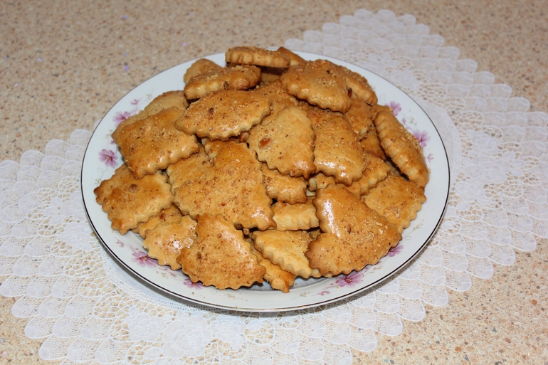 Орешки обжарить, очистить, порубить в крошку. Печенье промазать взбитым яйцом, посыпать ореховой крошкой. Отправить в духовой шкаф для выпекания
